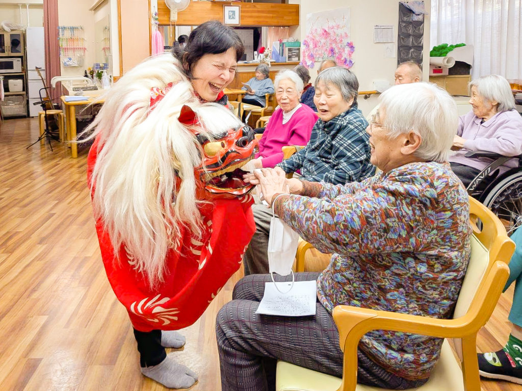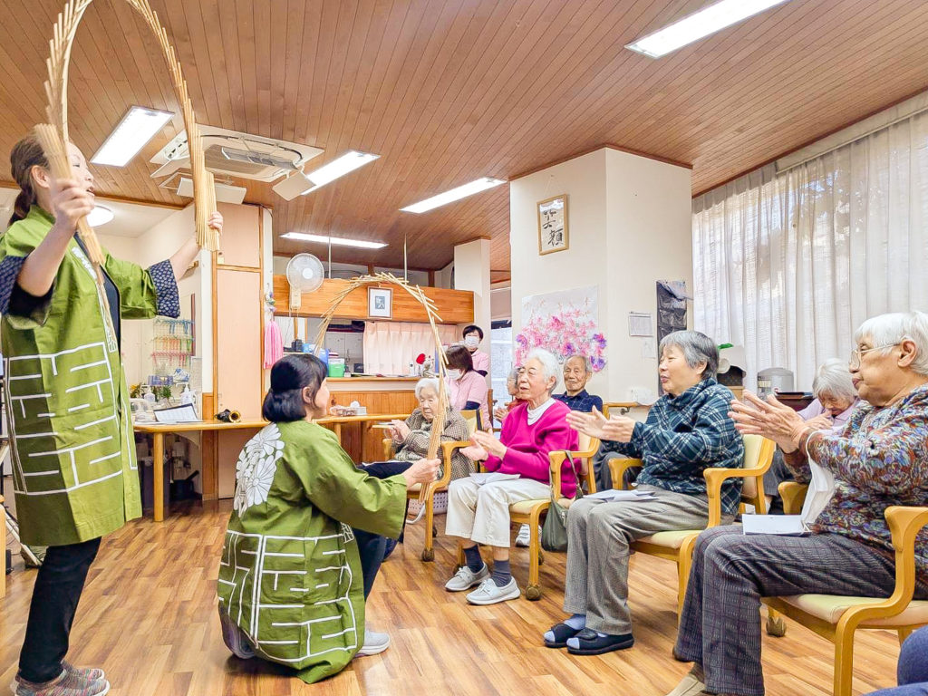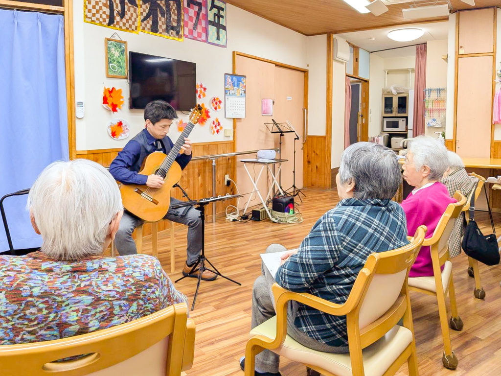 この日は、ハッピー楽団さんによる獅子舞や南京玉すだれを楽しみ、ギターの演奏に合わせて懐かしい歌を皆さまで合唱しました。会場は自然と手拍子が起こり、あたたかな雰囲気に包まれていました。