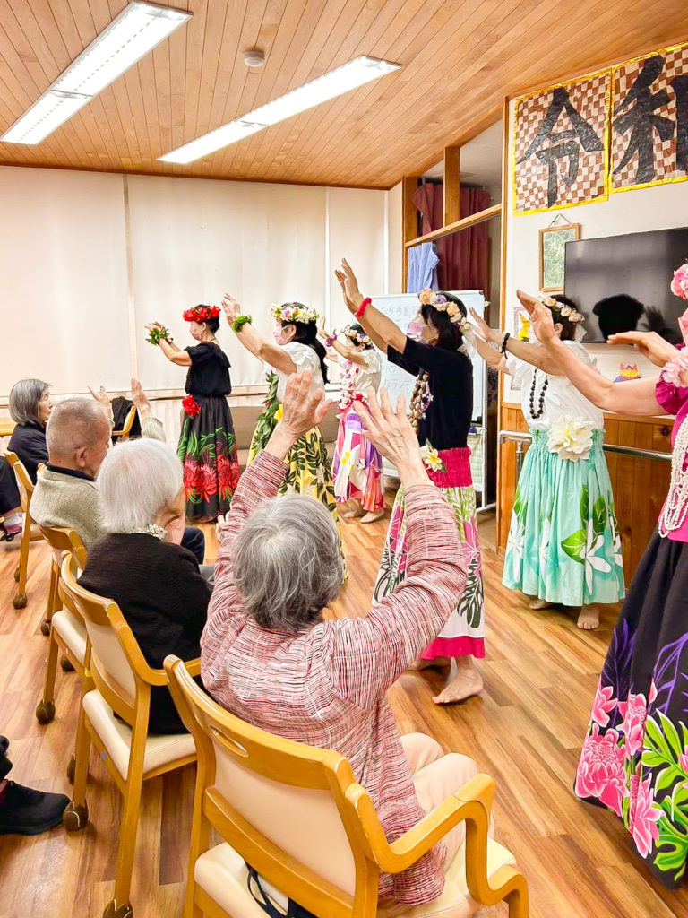 また、フラダンスのボランティアさんも来てくださり、ご利用者様も一緒にフラダンスを踊りました。